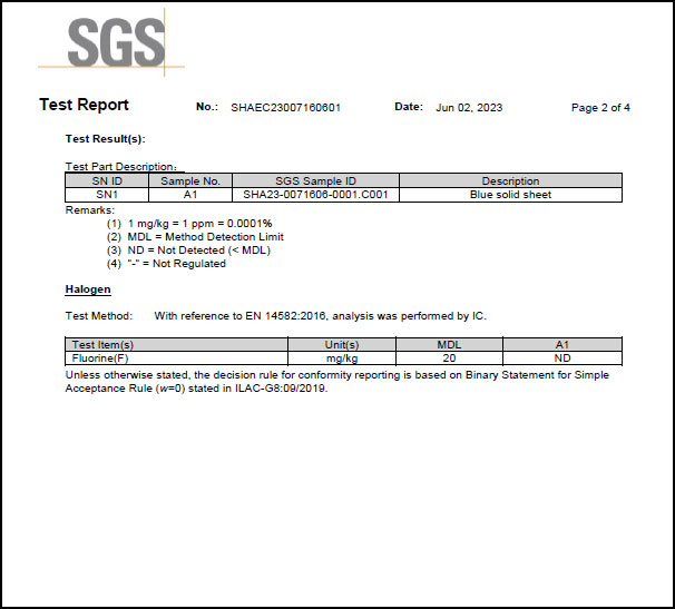 為滿(mǎn)足客戶(hù)需求近日SealTex索 ST-2058無(wú)石棉板通過(guò)了SGS進(jìn)行的鹵素(氟)檢測(cè),檢測(cè)標(biāo)準(zhǔn)EN 14582-2016,報(bào)告顯示未測(cè)出氟,報(bào)告部分截圖如下: